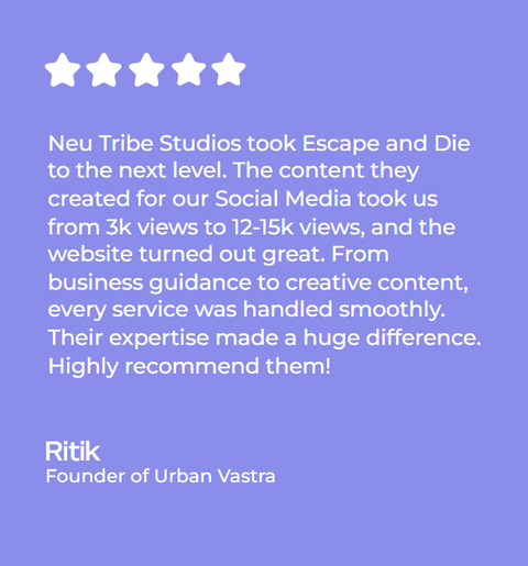 Neu Tribe Studios took Escape and Die to the next level. The content they created for our Social Media took us from 3k views to 12-15k views, and the website turned out great. From business guidance to creative content, every service was handled smoothly. Their expertise made a huge difference. Highly recommend them!